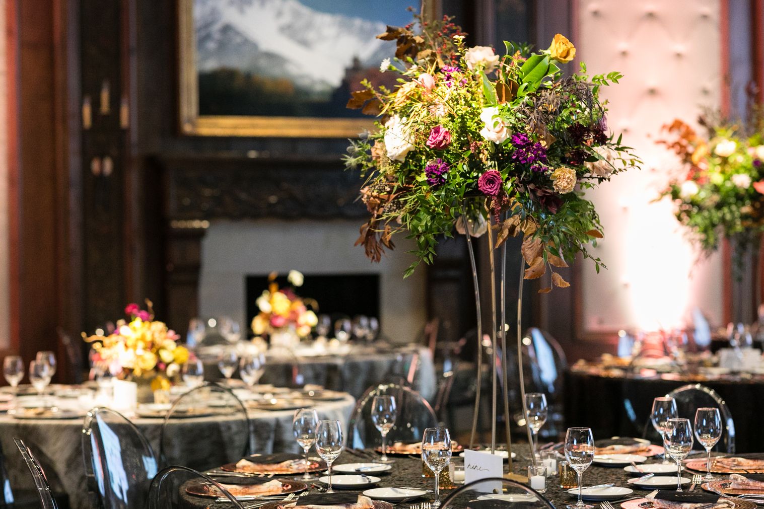 - Raised Centerpieces: these would be on a stand or potentially hanging from the ceiling above the table. Helpful if your venue has high ceilings to fill the space and make a statement. These can range anywhere from $350-1000 depending on the size and how many blooms are included, as well as if they are on a stand or suspended from the ceiling. Suspended floral arrangements, depending on their length will be the high end of the price range and may even go above that depending on how long they are.