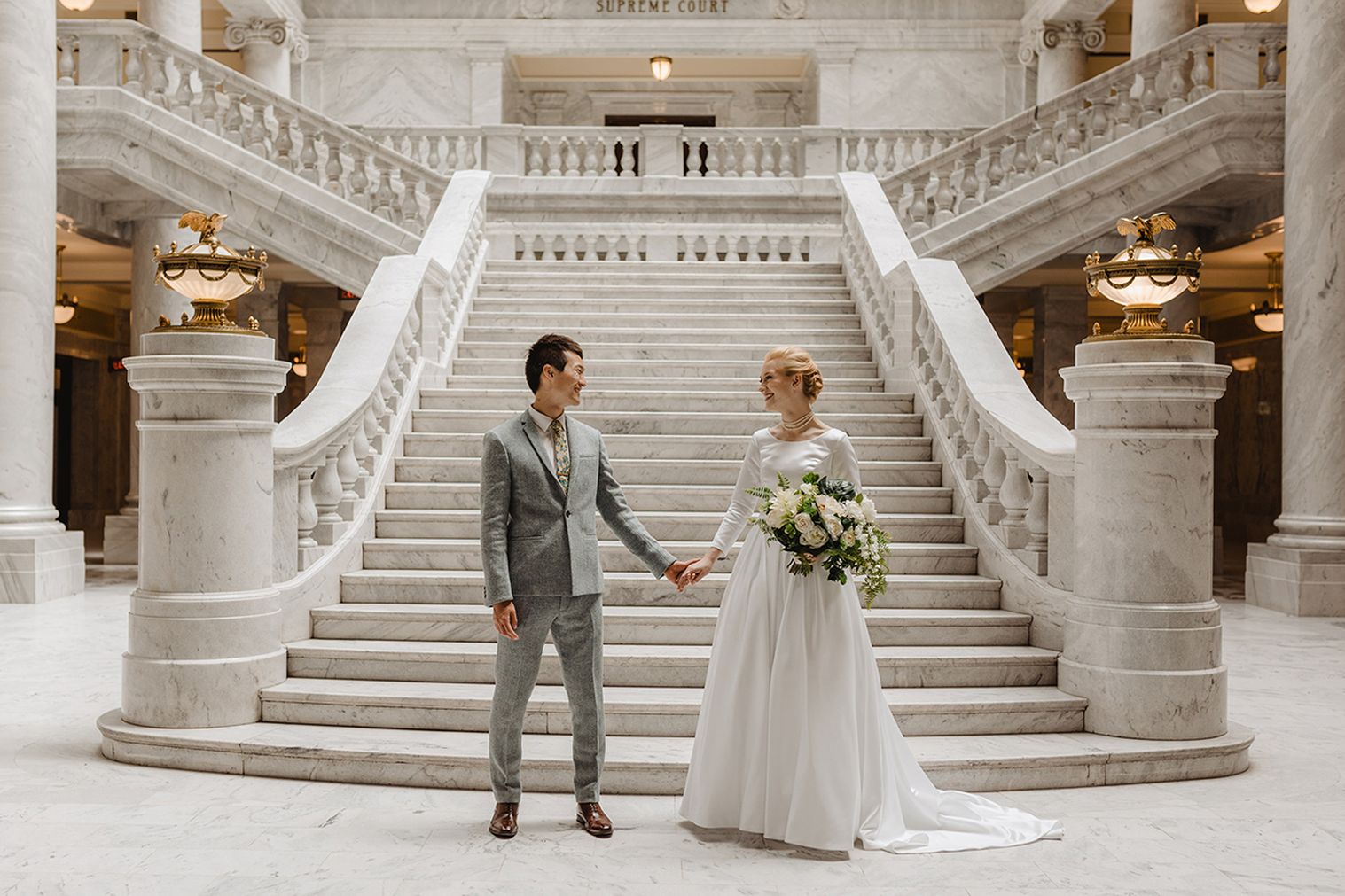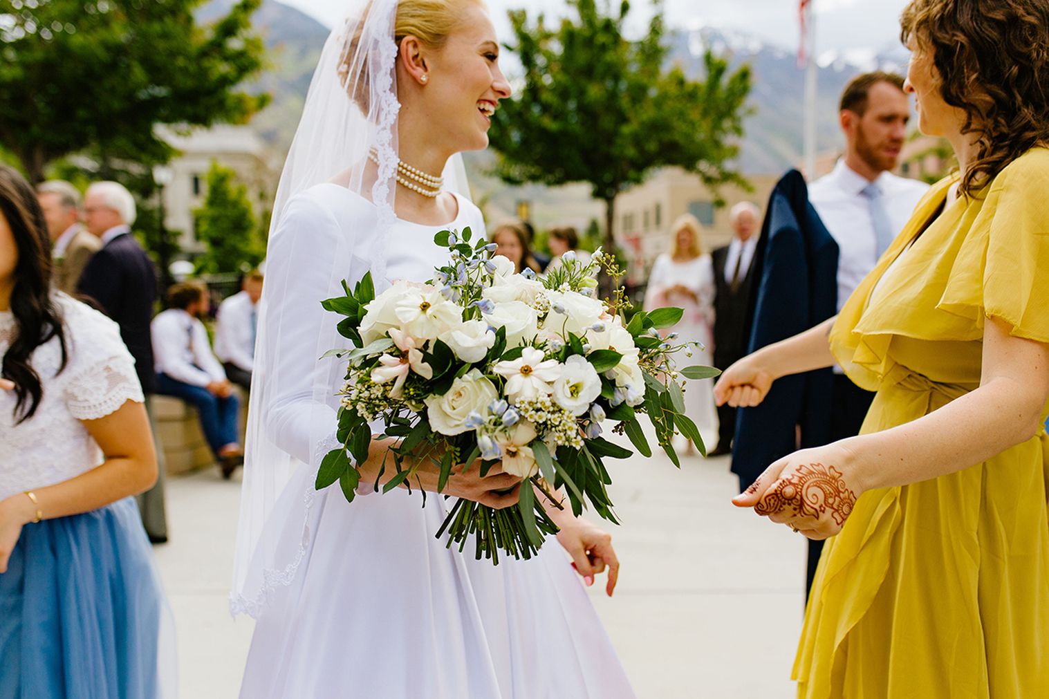 Temple wedding at Provo Historic Downtown Temple, reception at White Willow in Provo Utah. Garden style round bouquet with butterfly anemones. Petal toss for send off. Hydrangeas and antique garden roses in bud vases with blue books for centerpieces. Formals at Utah State Capitol with white and green cascading formal bouquet.