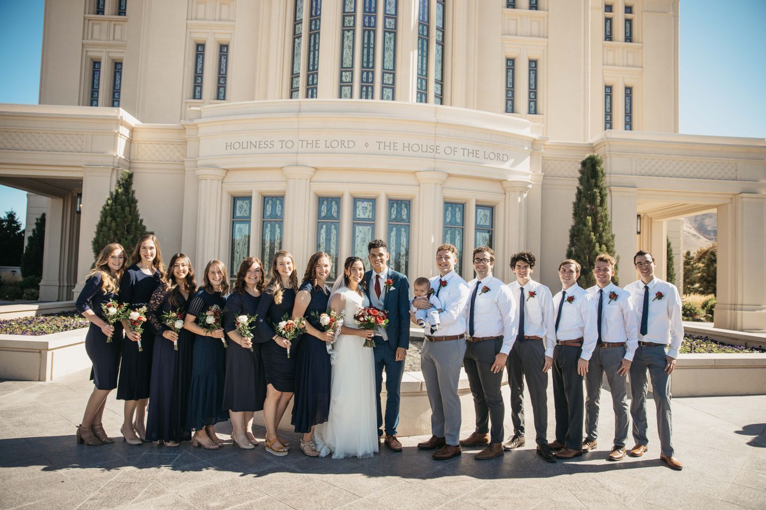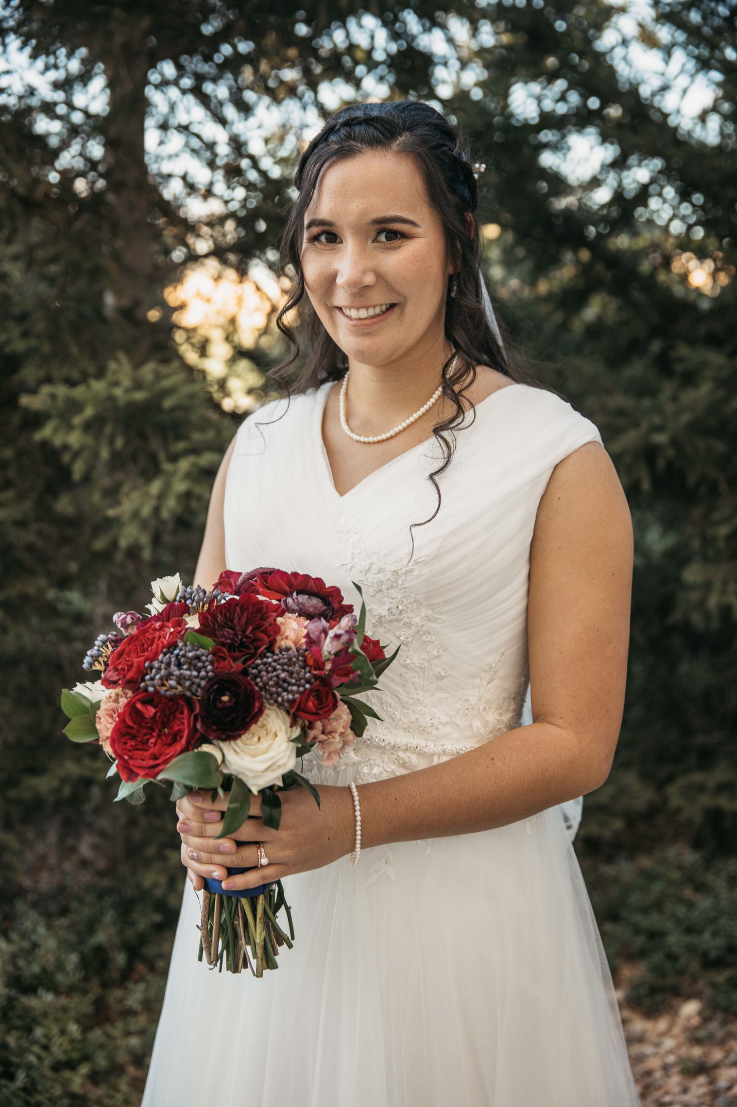 Fall wedding with burgundy and navy blue colors for the flowers with blush accents. Roundy-moundy bouquet with tess garden roses and blue viburnum berries. Flowers in bud vases for centerpieces. Reception with Korean and African traditions to honor parents cultures. In Spanish Fork Utah.