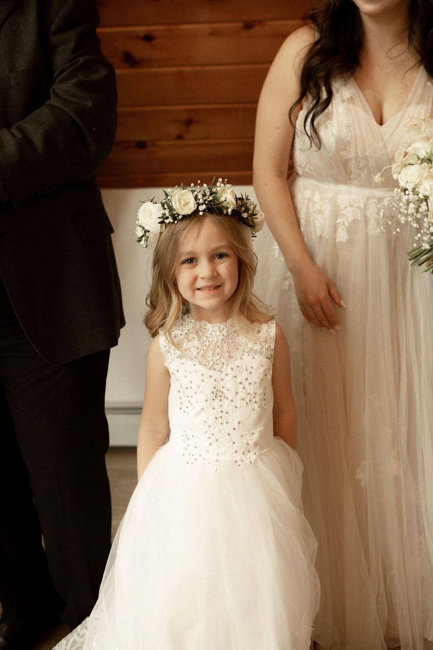 For the ceremony backdrop, the couple rented Bronte's Florals acrylic stands, also known as ghost pedestals. They had large floral arrangements placed on them to frame them during the ceremony, and then the repurposed them around the cake for the cake cutting. The white ethereal and whimsical flowers perfectly tied in the snowy landscape seen through the windows. The arrangements are mostly blooms with some dried elements to bring in the winter vibe. Symmetrical clear pedestals have large arrangements placed on top and on the ground at the base. Garlands made from fresh eucalyptus were placed on the long farmhouse tables for the wedding dinner centerpieces. They are a simple minimalist wedding centerpiece that is budget friendly and classy. The bride and bridesmaid bouquets are filled to the brim with delicate white flowers. The groom is Hawaiian and in addition to a boutonniere, he is wearing a Maile Lei that his parents brought with them from Hawaii. They also got corsages for the mothers, and flower crowns for the flower girls to wear while they spread petals. For a creative aisle runner, they used a eucalyptus garland on each side with floating candles in glass cylinder vases.